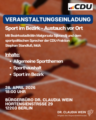 im April 2026 lädt Sie Frau Dr. Claudia Wein, MdA, herzlich zu zwei Veranstaltungen ein. Wir freuen uns, mit Ihnen ins Gespräch zu kommen und aktuelle Themen gemeinsam zu diskutieren: